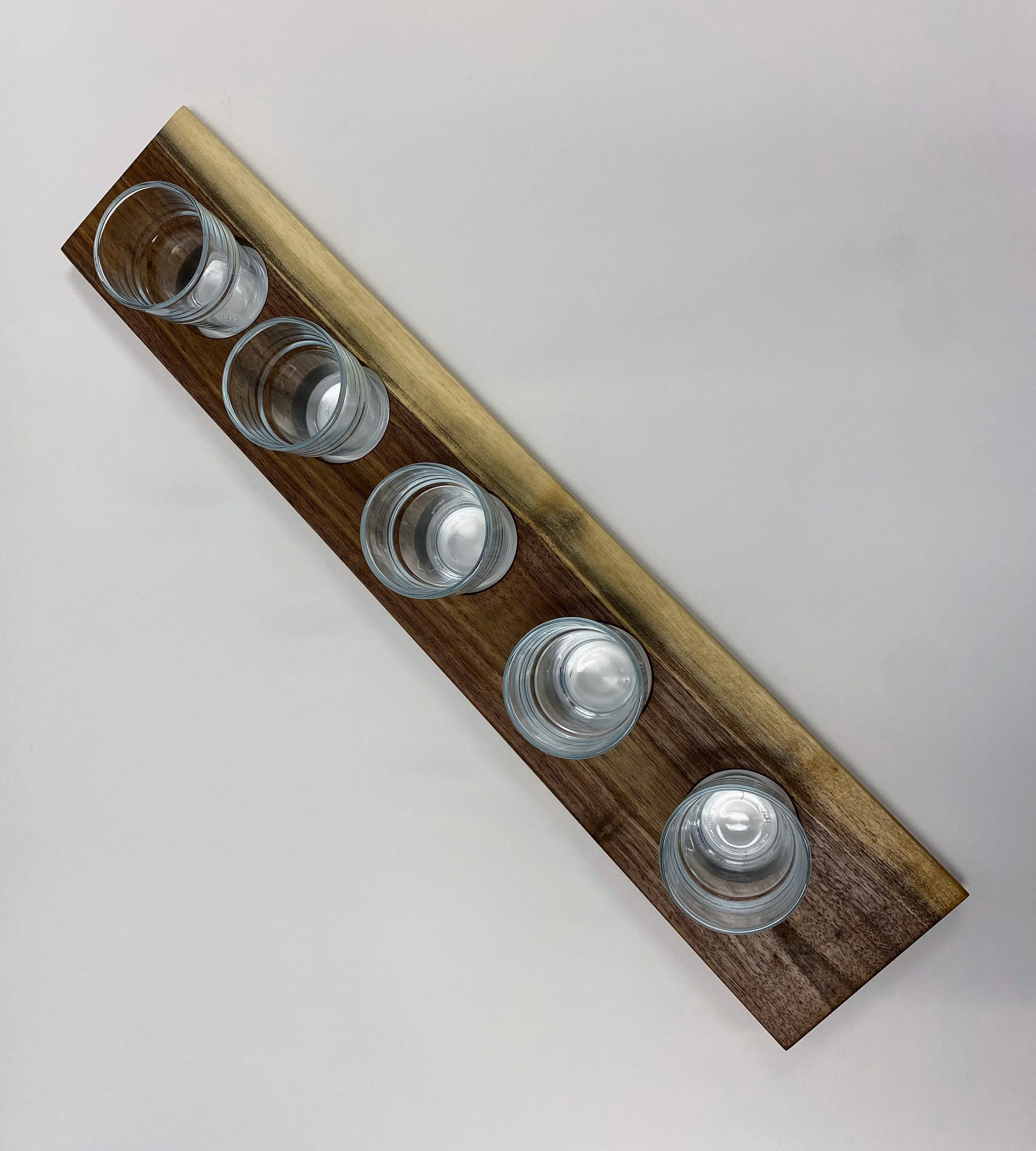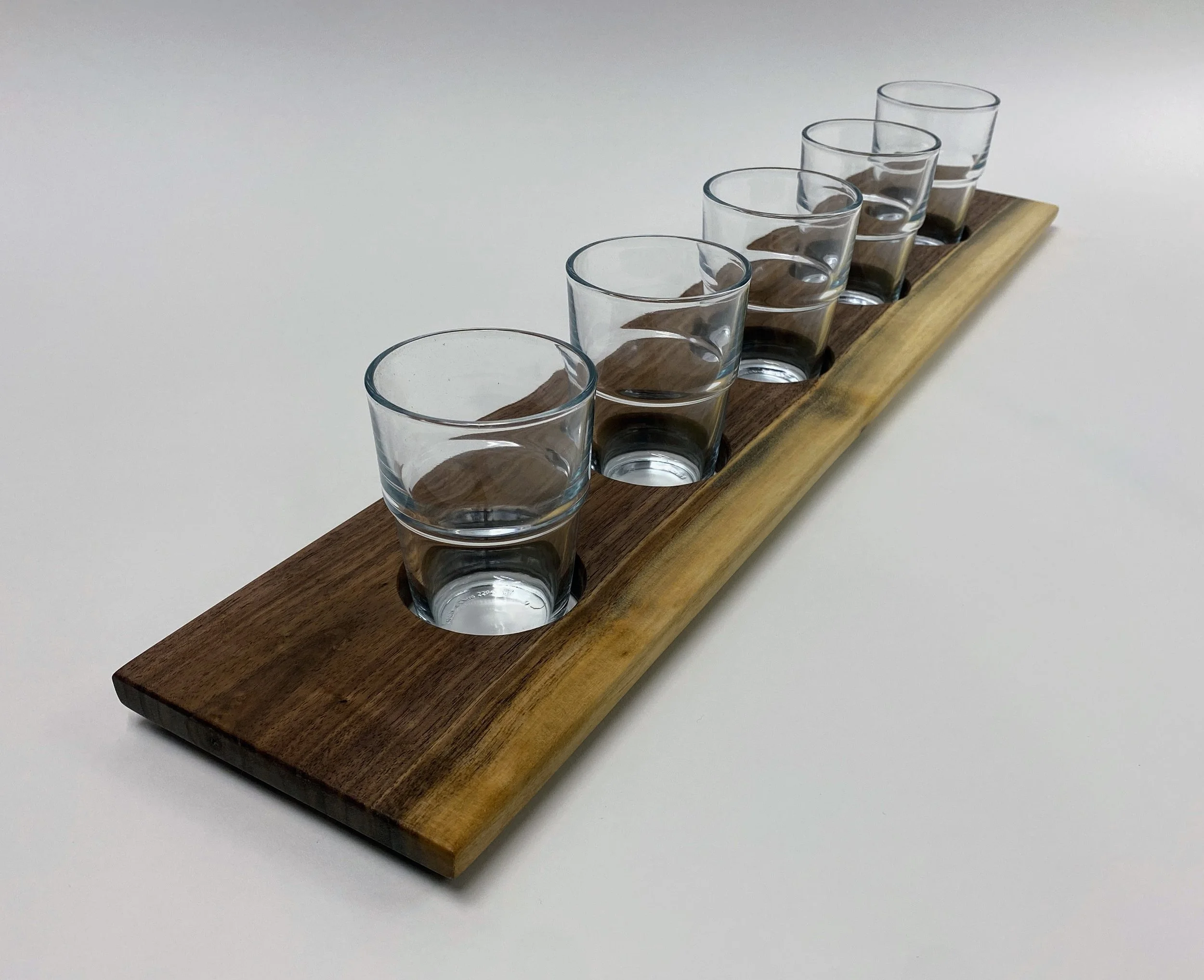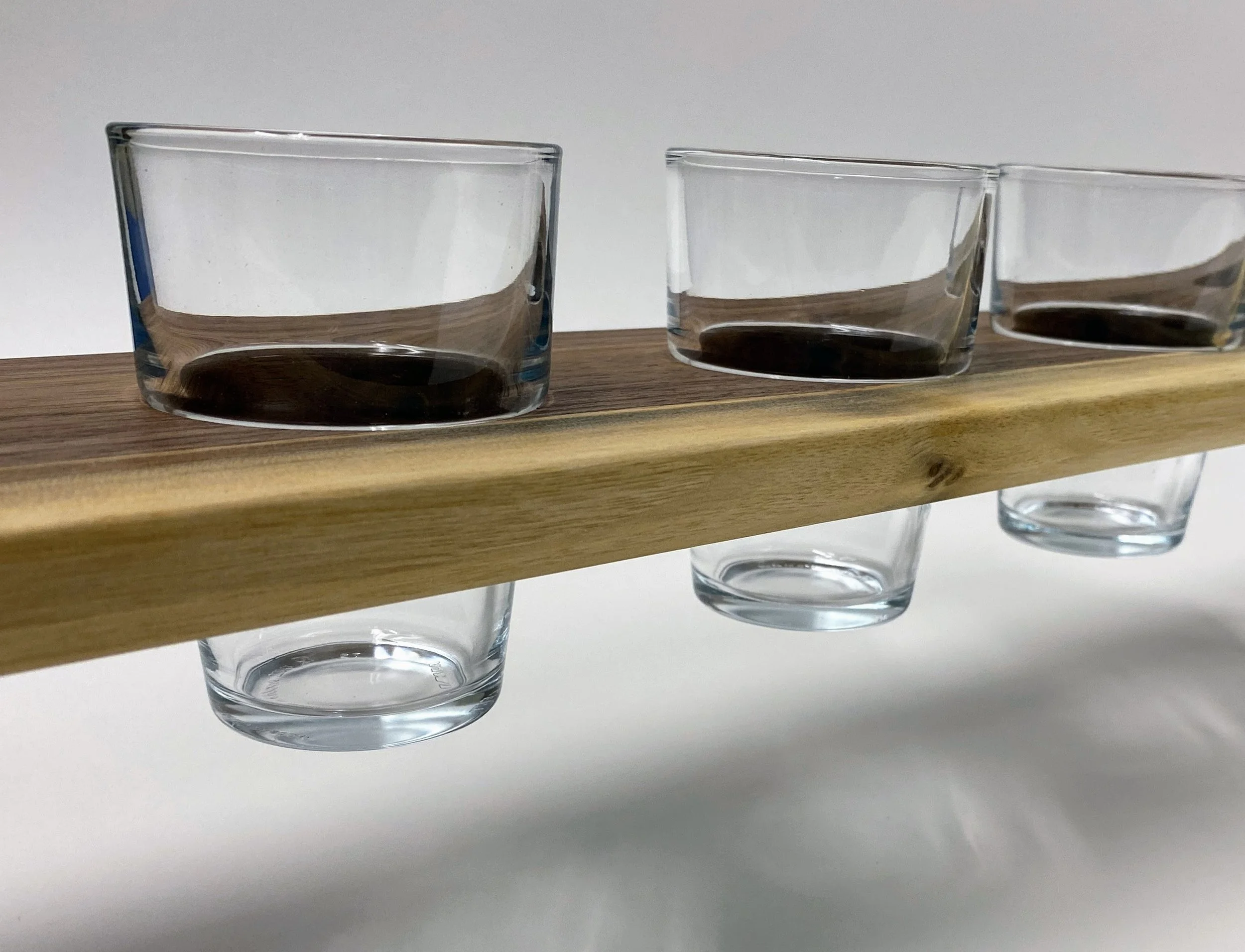 Walnut wood drink flight with 4 medium glasses included for your beer, whiskey, exotic orange juices - whatever whets your whistle!!